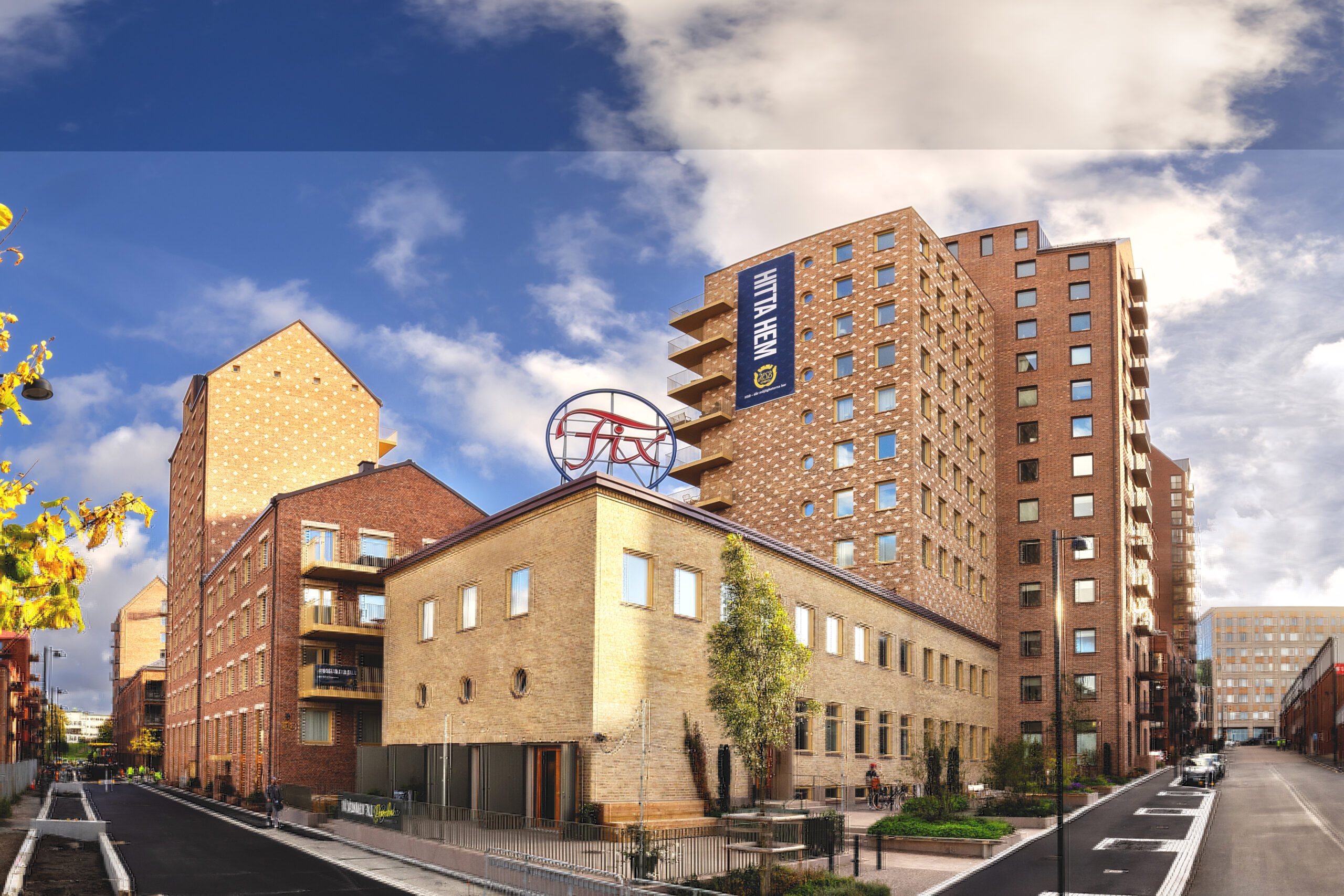 Bostadshus i Kvillebäcken med referenser till områdets industrihistoria. Fasaderna är murade i tegel och projektet använder återbrukade byggnadsdelar.