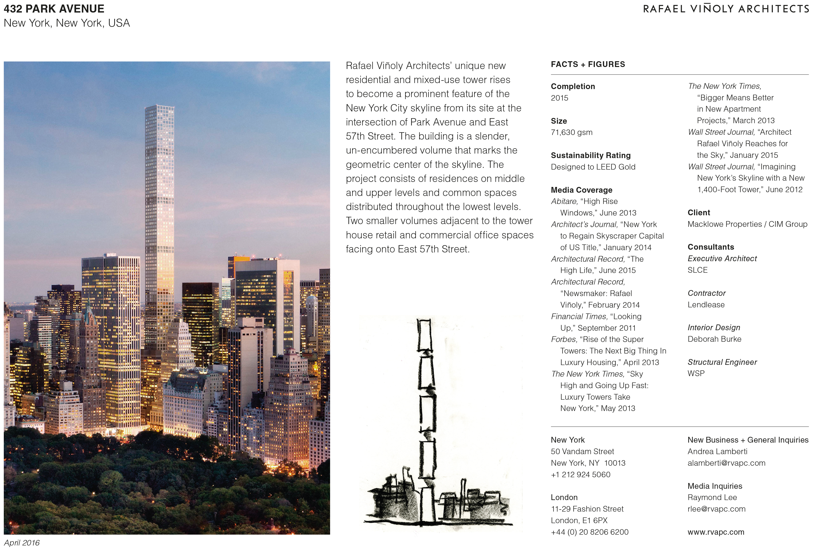 Tornet 432 Park Avenue ligger vid hörnet av Park Avenue och East 57th Street i Midtown Manhattan. Rafael Viñolys arkitektoniska koncept för tornet bygger på den perfekta kvadraten – tornet har en planform på cirka 28,5 × 28,5 meter och når en höjd på ca 426 meter. Det ger ett höjd/bredd förhållande på cirka 15:1, vilket gör konstruktionen extremt slank. Fasaden ger ett synligt, väl betonat, ramverk i vitt.