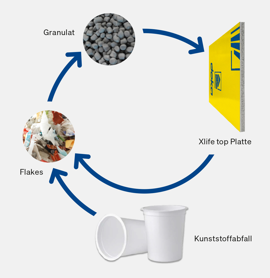 Xlife top bygger på en kärna av 100 procent återvunnen plast, integrerad i en plastkomposit med förstärkt ytskikt. Doka beskriver en sluten återvinningsprocess: när skivorna nått slutet av sin livscykel tas de tillbaka, materialet återvinns och används i nya kärnor. Denna cirkulära process skiljer sig från konventionella träkompositskivor som ofta har begränsad återvinningspotential och i slutändan blir avfall.