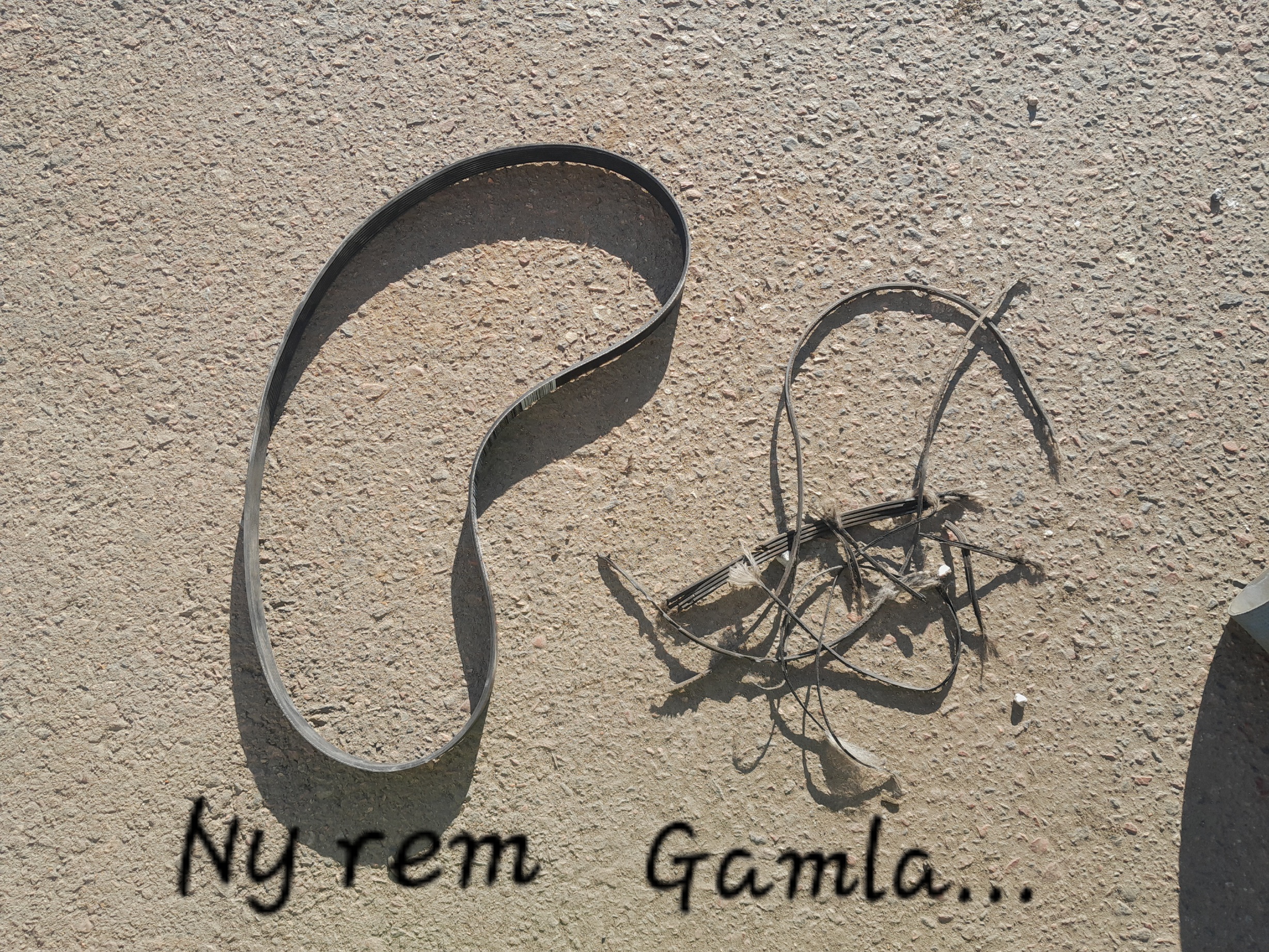 Rem fanns på Volvo, det var den simpla delen. Därefter började jobbet med att pilla loss resterna av den gamla remmen som givetvis hade kilat fast sig innanför remskivan så det var riktigt bökigt. Det är inte mer gott om plats bara för att motorn är stor kan jag meddela.