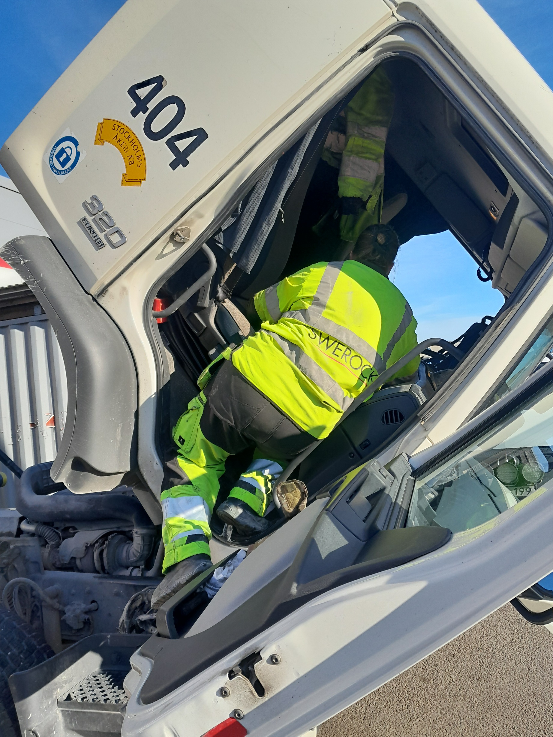 Efter en hel del möda var den nya remmen på plats. Innan vi fällde ner hytten igen skulle vi starta och se att det såg bra ut. För att göra det behövde jag blåsa i alkolåset som sitter monterat ganska mitt i bilen. Inte helt lätt att klättra upp och blåsa men det gick. Grejerna funkade så vid 16.30 kunde jag åka hemåt från verkstaden och ta helg. Trist extra kostnad i en bransch som redan är tajt ekonomiskt men skönt att det kunde lösas direkt i alla fall. Killar som Danne är guld värda!